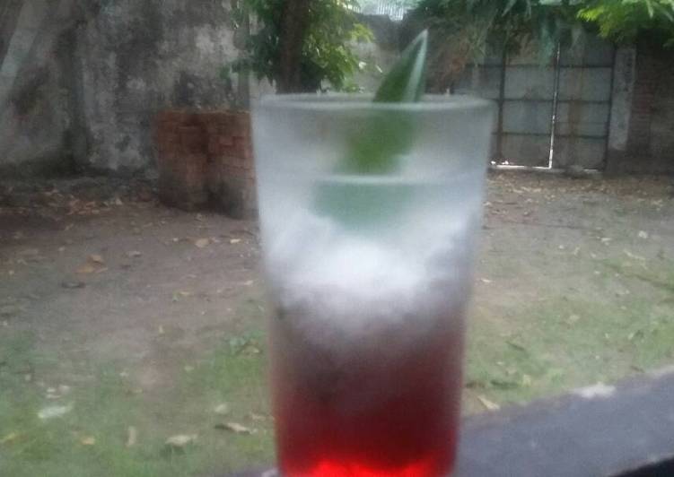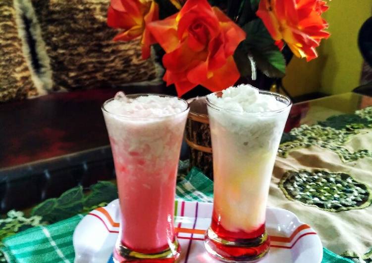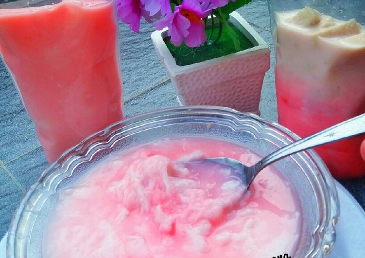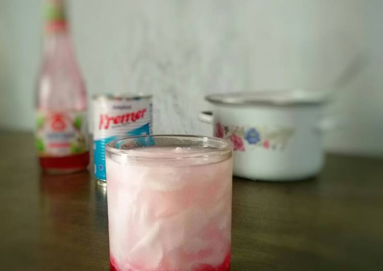 Masak semua bahan hingga mendidih. 1 bks agar-agar putih. Syrup merah coco pandan siap pakai.